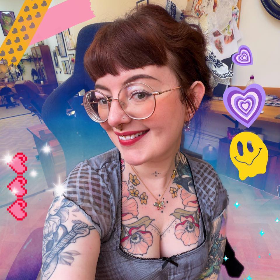 Hey, my name is Carys. I’ve started my journey tattooing in the South Wales area in 2018. In 2024 I made the leap to open my own private studio (go me!) in Newbridge. Its a small, women owned and run private studio. I have aimed to make my studio a comfortable space for people from all walks of life, and I welcome people of all sorts of abilities and backgrounds. It’s a quiet, cosy, chilled out atmosphere, where the focus is 100% on the customer, so my focus will be on creating some unique, and personalised artwork for you! No distractions, just vibes and cool artwork <3